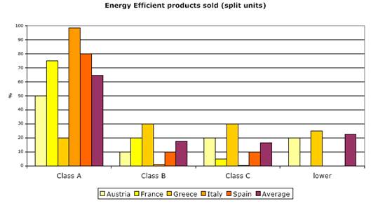 In line with the results of the EU-survey of “consumer attitudes related to EU Energy policy” [4], which states that 80% of EU citizens say energy efficiency influences their decision when buying household appliances (nearly half of them very much) and that they are quite certain that within the next decade they have to change their every day behaviour, but also the technology used to make their living space comfortable, also in the selection of air conditioning systems in almost all countries in Europe, energy efficiency is a major topic (see Fig. 6). This has a clear consequence on the selected products. In fact in Italy most products sold are classified as energy class A while in Greece more class B and C than class A products are sold. (see Fig. 7).
