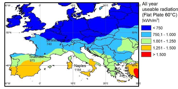 Three different locations across Europe have been analyzed in detail regarding heating and cooling loads as well as the available solar radiation. One central European location (Strassbourg, France) with less cooling than heating demand and two southern European locations: Toulouse (France) as an example with roughly equal heating and cooling demand) and Naples (Italy) as an example of a location with much higher cooling than heating demand.